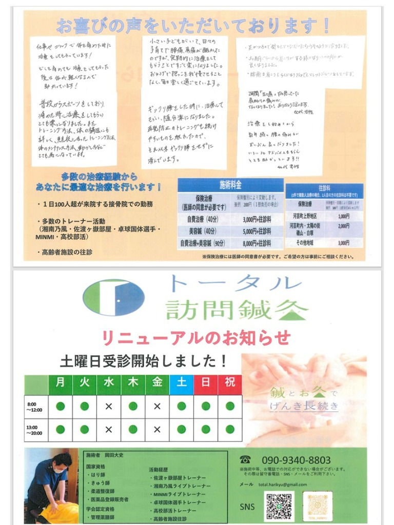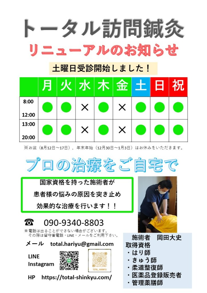 トータル訪問鍼灸は津市・鈴鹿市を中心にした地域で、肩こり・腰痛等さまざまな症状に対する訪問鍼灸治療を行っています!