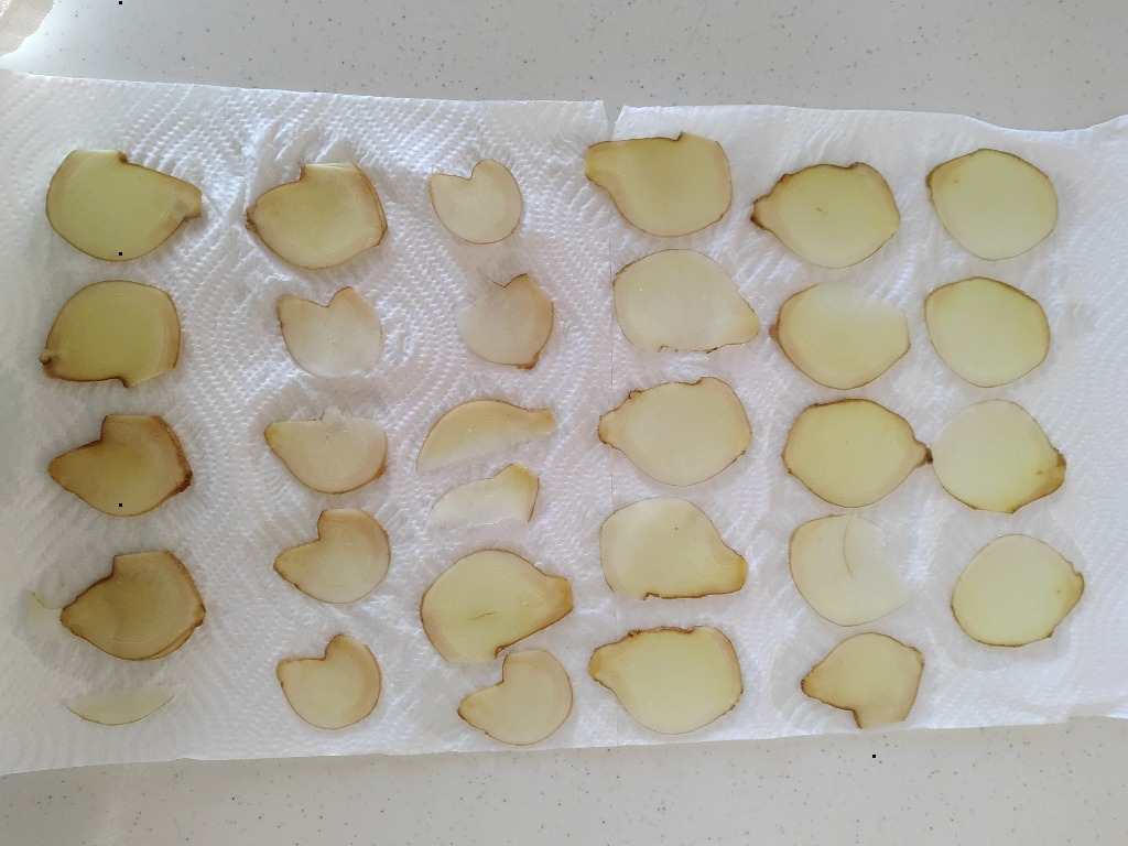 2.キッチンペーパーにスライスしたショウガを並べる。